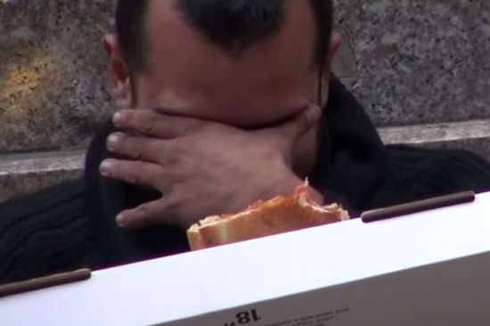 這名流浪漢當時光著腳坐在街頭,當攝影師送給他一塊比薩餅時,他不知道自己正在被攝像機拍攝。