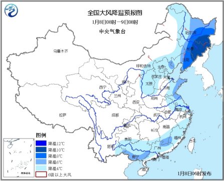 8至9日,較強冷空氣繼續影響中國中東部地區,長江中下游及以北地區將先后出現4~5級偏北風,大部地區氣溫將下降4~8℃,局地降溫可達10~12℃。8日06時中央氣象臺繼續發布大風降溫預報,8日08時至9日08時,內蒙古東部、東北地區、華北大部、黃淮東部、江淮中東部、江南東北部和南部、華南大部等地有4~6℃,局地8~10℃降溫;上述大部地區并伴有4~5級偏北風。