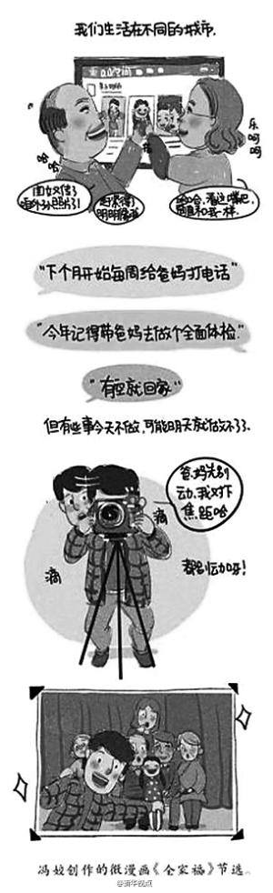 “親人是一生一次的緣分,在相聚的時候拍一張全家福吧,也許是今年最大的成就。”“春節與父母團圓,拍一張全家福,讓幸福定格。”近日,成都大四“90后”女生馮姣創作的漫畫《全家福》在網上流傳,很多網友稱“被戳中淚點”,讓家的溫暖在這個春節蔓延。
