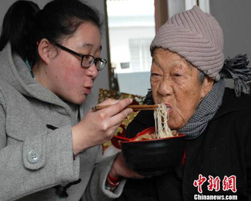 正月初一,江雨佳為70歲老人陳新順送去湯圓;正月初三,她為69歲老人林小英送去水餃;正月初四,她來到62歲老人陳夏秋家中,幫忙打掃衛生;正月初六,她喂98歲高齡的孤寡老人林文錦吃長壽面。