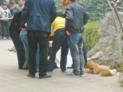 昨天中午,天氣有些燥熱。警方在女尸周圍拉警戒線,金毛犬一直蹲在小主人身旁,它身體緩緩抽搐,不斷發出微小的“嗷嗷”聲,好心的路人主動喂給它各種食物和水,但是,不管路人如何呼喚,它都不理不睬。直到小主人的父親喂給它礦泉水,它才迅速把老人手上的水舔干凈,隨后跳躍起來,不斷舔著老人的胳膊和臉頰向他示好。見此情景,圍觀的游人不禁潸然淚下。“多好的狗啊!若是沒人照顧,我想養它。”不少游客如此感嘆。