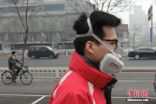 3月27日,北京街頭一位民眾戴著專業防霾面具前行,其面罩濾芯上已經附著許多污物。
