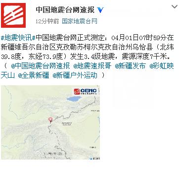 據中國地震臺網正式測定:4月01日07時59分在新疆維吾爾自治區克孜勒蘇柯爾克孜自治州烏恰縣(北緯39.8度,東經73.9度)發生3.4級地震,震源深度7千米。