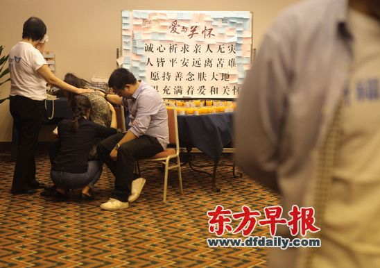 今日凌晨0時44分,239支蠟燭點燃,在麗都飯店,家屬們聚集在一起為MH370航班機組人員和所有乘客守夜祈福。