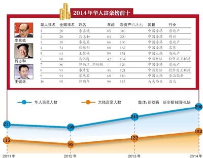 福布斯中文版昨日公布了2014年華人富豪榜,香港富豪李嘉誠以310億美元財富再次位居華人之首,這也是其連續第十六年奪得華人首富寶座。新賭王呂志和升至第二,萬達董事長王健林以151億美元成為大陸首富,華人第五。馬化騰則首次成為大陸第二大富豪。