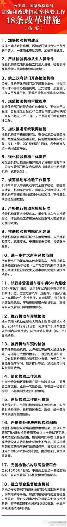 據公安部治安管理局、公安部“打四黑除四害”專項行動辦公室官方微博消息,公安部、國家質監總局今日發布《關于加強和改進機動車檢驗工作的意見》,《意見》明確,公安、質監等政府部門不得開辦車檢機構,已開辦的,9月底前必須徹底脫鉤;自9月1日起,試行非營運轎車6年內免檢;不得指定檢驗機構,推動機動車異地年檢。18項新政摘要如下。