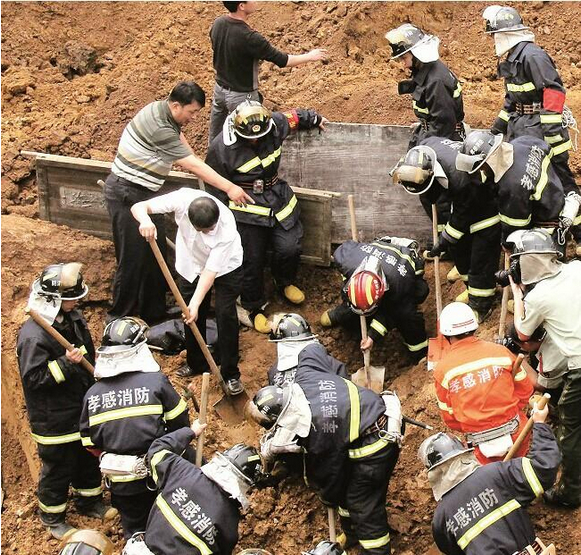 安陸消防中隊(duì)10名官兵經(jīng)過近1個(gè)小時(shí)救援,成功救出被困農(nóng)民工。不料,抬送過程中,工地發(fā)生大面積二次塌方,3名消防官兵和剛剛獲救的農(nóng)民工被埋。事發(fā)后,省消防總隊(duì)、孝感市消防支隊(duì)及孝感市、安陸市相關(guān)負(fù)責(zé)人趕到現(xiàn)場,200余人的救援隊(duì)伍與時(shí)間賽跑近5個(gè)小時(shí),被埋壓的4人被救出。遺憾的是,他們均因傷勢(shì)過重,經(jīng)搶救無效死亡。