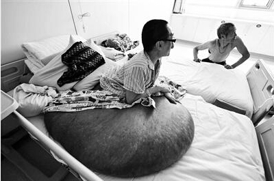 北青報記者看到,當楊建斌坐起來的時候,這個巨大的腫瘤看起來就跟鋪在床上一樣,一張小病床幾乎放不下,因此,醫院將兩張病床拼在一起,以方便他能夠躺臥。而掀起腫瘤的一邊,很清楚可以看到,他的右腿非常細,皮膚有些蒼白。楊建斌說雖然腫瘤很大,但只要不使勁摸就不會感覺到疼,但現在腫瘤長得太大了,已經影響到了他的正常活動,他現在沒法走路,去廁所都要父親幫忙才行。“平時只能躺著或者坐著,什么活都干不了,家里的活都是別人干,我只能坐在一邊看著,很無奈。”