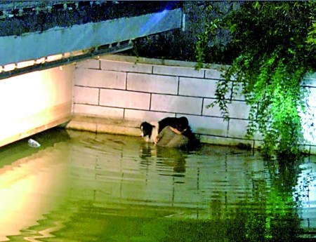 被困在河里的小伙子告訴消防員,他叫胡曉東,20多歲,家就住在附近。他托舉的狗狗,是條邊疆牧羊犬。小胡稱,這條邊牧犬,體重有70多斤,為了不影響他人,他總是在凌晨陪愛犬來散步,這樣的情況已有近兩年時(shí)間了。可昨日凌晨1:30許,當(dāng)走到南門橋時(shí),愛犬在回頭看小胡時(shí),不慎一腳墜入了河中。其實(shí)水面離岸邊也就不到2米高,本以為邊牧犬會(huì)自己游回來,但由于護(hù)坡是斜的,它嘗試了幾次都無法上岸。手足無措的小胡,干脆跟著跳下河去,邊安撫邊想辦法讓愛犬脫險(xiǎn)。