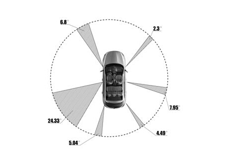 以左前A柱盲區量為例,讓工作人員手持一根豎直的長桿,沿著圓形邊緣逆時針緩慢移動,當測試者將看不到長桿的時候我們給地上做一個標記。然后工作人員繼續移動,當測試者將看到長桿時做另外一個標記,這兩個標記點與圓心的夾角就是要測量的左前A柱的盲區。同理其他各立柱的盲區也是用同樣辦法測量。