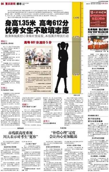 盡管這個分數令家人很是驕傲,但李密先后填的兩所一本高校都以“身體條件不行”退回了她的檔案,最終,她被二本院校重慶交通大學化工專業錄取。