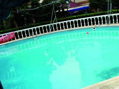 事發游泳池就在小區入口處,面積大約有200平方米。目前,游泳池已經關門停業,透過隔離網可以看見,游泳池里的水還是滿的。