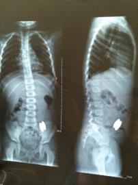 醫院X光檢查顯示,這兩塊磁性橄欖球長2.8厘米、直徑0.8厘米,它們隔著彎曲的小腸壁吸附在了一起,導致無法自行排出體外,靜靜父母準備將孩子送到重慶進行手術。醫生提醒說,靜靜體內的磁鐵應盡快取出,否則有較大危險,容易引發腸道損傷,嚴重可能導致穿孔或者壞死。