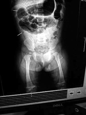 北京晨報(bào)記者了解到,目前體內(nèi)的12根鋼針多分布在孩子的臀部,一根在腹部,其余3根在胸腔附近,其中一根很接近心臟(如圖)。“因?yàn)楹⒆犹,醫(yī)生們害怕取針的時(shí)候?qū)λ斐蓚,在胸腔附近?針可能會(huì)威脅她的生命”。