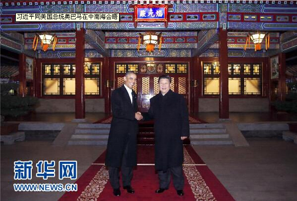 11月11日晚,國家主席習近平在中南海同美國總統奧巴馬舉行會晤。這是兩國元首在瀛臺涵元殿前握手。 新華社記者 鞠鵬 攝