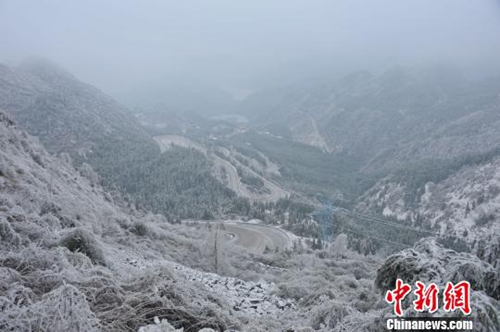 圖為素有貴州最高公路之稱的102省道梅花山路段被冰雪覆蓋 鮑光翔 攝