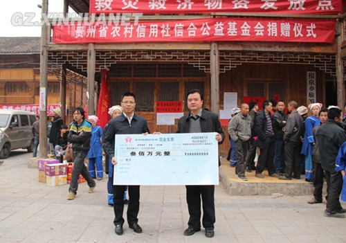 貴州省農村信用社聯合社理事長黃秋斌日前代表貴州信合基金會在鎮遠報京災區向捐款300萬元,幫助群眾進行災后重建。此外,貴州省農信社還委派鎮遠農信聯社對當地受災群眾提供總額度為3000萬元的貸款,為災后重建資金提供更多來源渠道,當地群眾可自愿辦理。