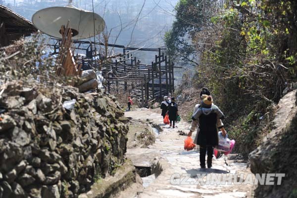 1月30日,在貴州鎮遠縣報京鄉報京村,受災村民領到年貨后趕回去做年夜飯。新華社記者 王念 攝