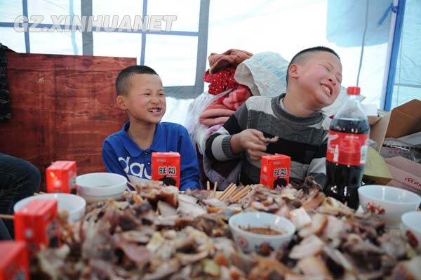 天色還未晚,村民邰邦明家的年夜飯早早就開始了。按照侗族風俗,帳篷外點燃兩支蠟燭,放上了豬頭、糯米粑、水果等供品,祭奠祖先。帳篷里臨時搭的桌子上堆滿了臘肉、雞肉和飲料,一家人熱情地拉記者一起過節。“盡管這個除夕得在帳篷里過,全家人熱熱鬧鬧在一起,還是很高興。受了災,肯定有難處,但是我們都相信沒有克服不了的困難,今后要把家建得更好。”邰邦明說。