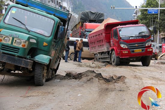 本網訊 12月11日上午10時許,貴州省鎮遠縣城因道路改造,兩輛重載車輛接連陷入主干道共和街一處軟泥路面,導致部分路段交通擁堵。交警增派警力疏導,緊急救援,直至12時左右,道路通行恢復正常。