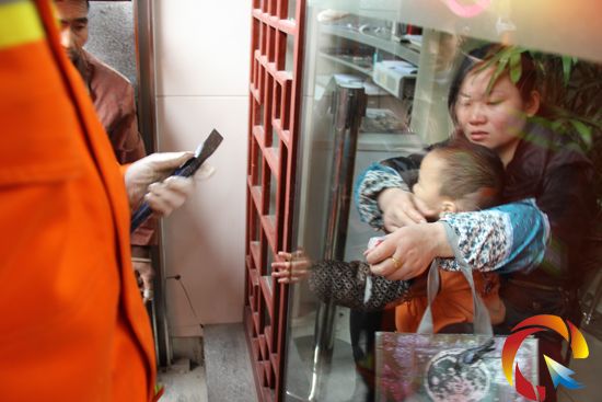 12時(shí)01分,消防官兵到達(dá)現(xiàn)場后,發(fā)現(xiàn)一小孩整個(gè)左手掌卡在工商銀行推拉鋼化玻璃門側(cè)邊狹縫里。由于小孩的左手掌被推拉鋼化玻璃門狹縫緊緊卡住,給救援帶來了一定的難度。為了不造成二次傷害,現(xiàn)場指揮員不斷安撫小孩,轉(zhuǎn)移其注意力。在做好全面防護(hù)措施后,中隊(duì)官兵利用撬棍和消防腰斧頭慢慢對(duì)鋼化玻璃門實(shí)施擴(kuò)張破拆,待間隙被撐開后立即將小孩的手從狹縫里拉出。經(jīng)檢查,小孩左手已經(jīng)紅腫,立即送往醫(yī)院救治。