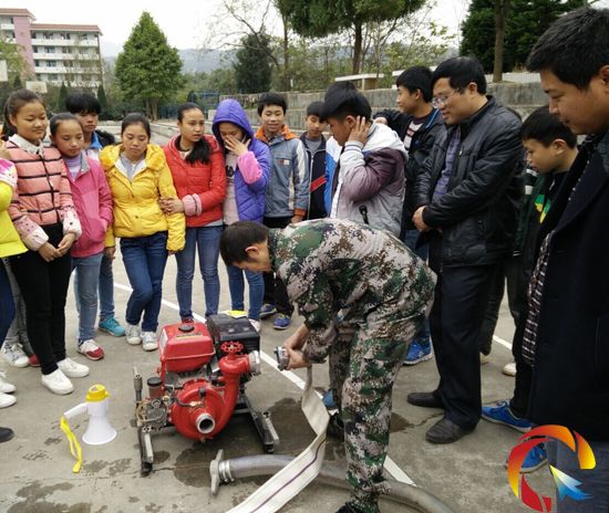 在培訓過程中,安監站工作人員首先向師生們講述了日常生活中校園及家庭用火、用電注意事項和防火、滅火常識,并重點講解如何撥打119報警電話求助、如何使用滅火器、如何逃生自救、如何對火災隱患進行排查以及講解寒假期間上坡不帶火種進山,玩火等各項規定。為了增強培訓效果,安監站工作人員還現場組織師生進行應急搶險演練,工作人員一邊向師生講解消防泵的性質、用途、特征,一邊給師生演示消防泵的使用方法。只見工作人員起動發動機后打開引水器開關,然后左手拿著消防水槍,右手打開水泵出水閥,只聽“嘩”一聲,一股水就從消防水管沖了出來;學生們都躍躍欲試,一個、兩個、三個…參加演練的學生輪流學習操作消防泵進行滅火演練,演練活動取得了實實在在的效果。