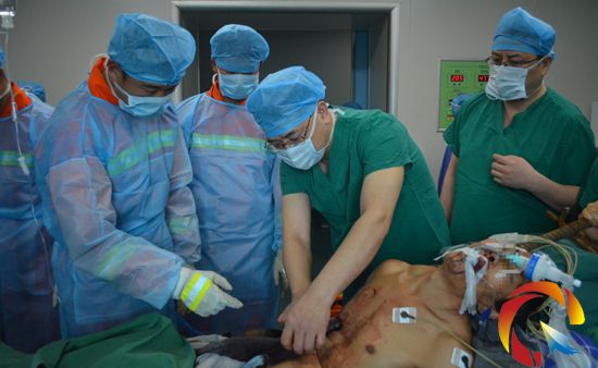 施救中,根據醫生的指點,消防官兵對未進入體內的鋼筋實施切割。切割時,火光四濺,為了不讓它灼傷受傷的工友,造成二次傷害,醫生用醫學布料將他保護了起來,20分鐘后,切割完成。