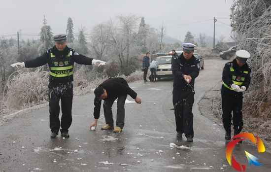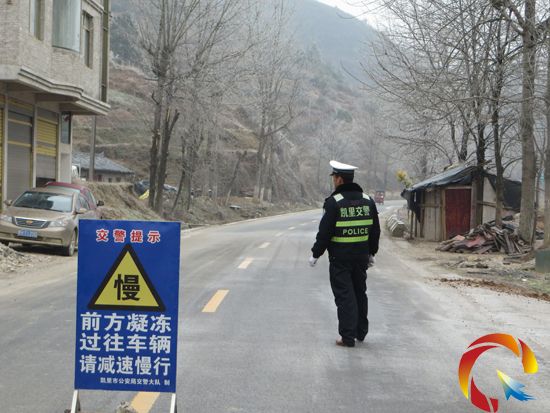 警情就是命令!凱里市公安局交警大隊聞警而動,分管農村交警中隊副大隊長楊明明帶隊深入冰凍一線抗冰抗凍。