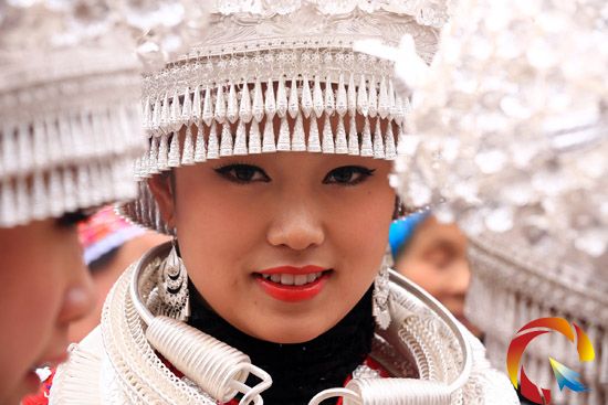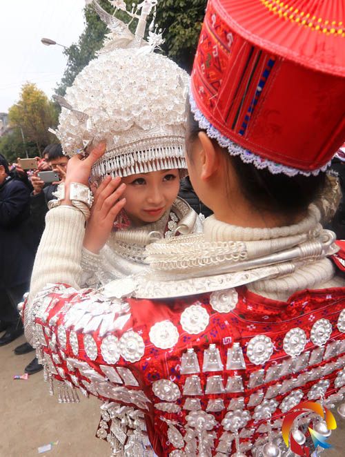 本網訊 3月7日,苗族姑娘盛裝參加慶祝三八婦女節。當日,在凱里市灣水鎮,苗族婦女們穿上盛裝參加慶祝活動,她們穿上自己的一針一線繡出來的盛裝和定制的銀冠,跳起蘆笙舞,對山歌,展示苗族女子心靈手巧聰慧,秀一秀自己的勤勞美麗和當地苗族婦女已經過上了幸福快樂的生活。