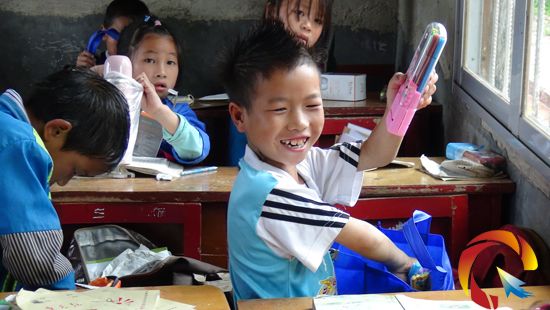 圖為高貢小學學生收到學習禮品時臉上樂開了花