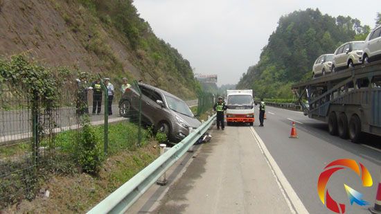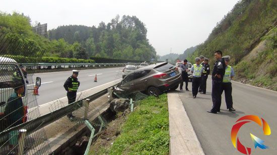 當天早上11點左右,黔東南州交警支隊高速大隊二中隊接到報警稱蘭海高速凱里往都勻方向1485公里處有一輛越野車失控,從國道沖下高速公路。接到報警后,二中隊民警迅速趕赴事故現場,到達現場后,發現一輛號牌為貴JAY002的小型越野客車沖出210國道,沖破蘭海高速公路外側網護欄,再碰撞路肩上波形防護欄,最后被迫停駛在國道外側在高速公路路基之間,車頭受損嚴重,高速公路防護網和波形防護欄不同程度損壞,所幸的是該車駕駛人系了安全帶而沒有受傷。不久后,事故車輛被救援隊拖離事故現場,道路恢復正常通行。