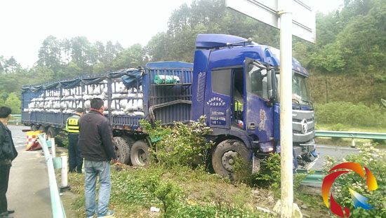 發生事故后,黔東南州交警支隊高速大隊二中隊的民警火速趕往事故現場,到達現場后,只見一輛滿載貨物的半掛牽引車停駛在“導流線”處,車身有一半沖進了前方的綠化帶,車頭與波形防護欄碰撞后嚴重損壞,被碰撞變形、損壞的波形護欄足有8米余長,被撞壞的水泥墩碎渣灑滿一地,所幸的是當時未有其他車輛從旁邊通過,不然后果不堪設想。為了避免次生事故發生,迅速恢復道路交通,民警在做好交通安全防護措施和維護好交通秩序前提下,與路政、高速應急部門迅速展開救援,不久后,救援工作順利完成,道路恢復了正常通行。