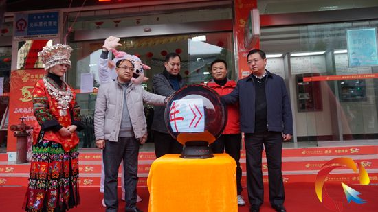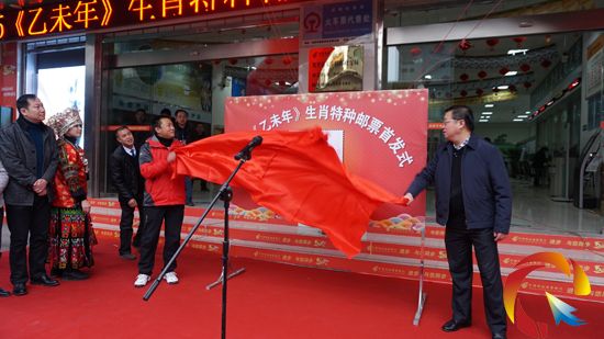 黔東南州郵政管理局局長(zhǎng)王新華、黔東南州郵政分公司馬軍總經(jīng)理共同為“羊年郵票”首發(fā)式揭牌。