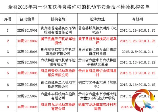 本網訊 (記者 劉承宇) 日前,省質監局公布了截至截至2015年第一季度獲得資格許可的機動車安檢機構的名單,我州新增凱里市九龍機動車檢測有限公司等4個機構獲得資格許可。