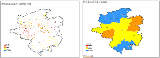 圖2 2015年6月10日8時~11日8時地質災害(左)、山洪 (右)風險預預報