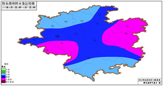 本網訊 預計2015年6月10日下午~11日上午我州自北向南將再次出現暴雨天氣,雨量中到大雨,清水江流域及以南地區有暴雨,部分鄉鎮大暴雨,局部伴有強雷電和短時強降雨,請加強防范山洪、滑坡、城鎮內澇等災害。