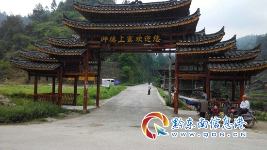 一條清亮的小河旁邊的苗寨,走進宅門的鋪滿青苔和歷史故事的石頭步道,寫有“朗德上寨”字樣宅門的苗寨入口……