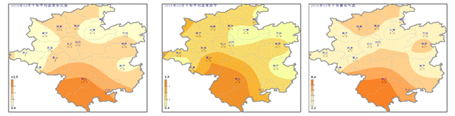 氣溫:2月下旬我州各地平均氣溫6.6~12.5℃ (圖1左),與歷年同期相比偏高0.3~1.9℃(圖1中);旬極端最低為2.2~8.4℃(圖1右),出現在28日。除28日外,其余時間各地日平均氣溫均維持在5℃以上。