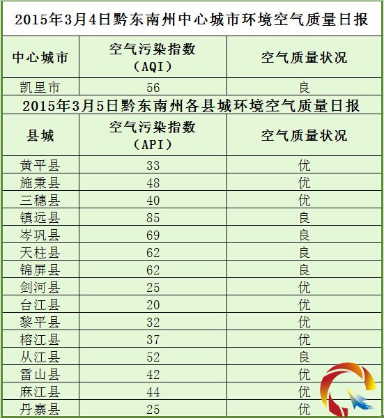 2015年3月5日黔東南州各縣(市)環境空氣質量日報