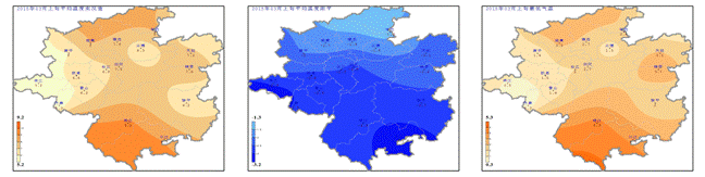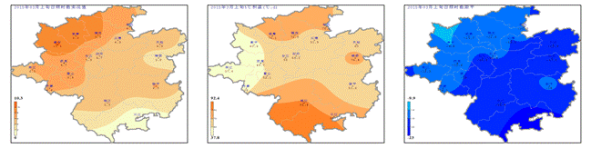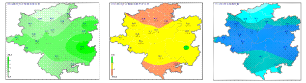 降水量:3月上旬我州各地降水量為4.3~24.7mm (圖2左);與歷年同期相比黎平偏多5.6%,其余地區偏少14.9~66.4% (圖2中);旬內日降水量≥0.1mm的日數4~9d (圖2右),旬內各地以低溫降雨天氣為主,但降雨強度小,沒有中雨以上天氣出現。