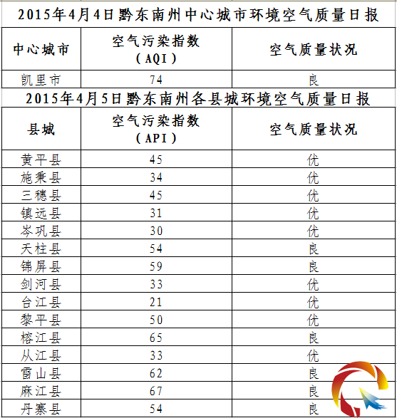 2015年4月5日黔東南州各縣(市)環境空氣質量日報
