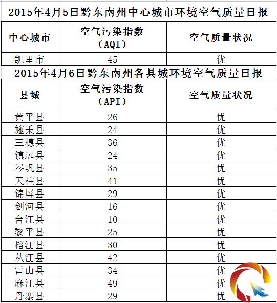 2015年4月6日黔東南州各縣(市)環(huán)境空氣質(zhì)量日?qǐng)?bào)