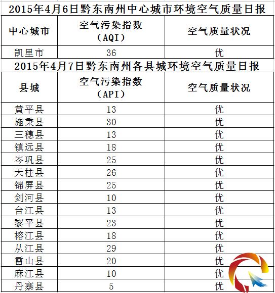 2015年4月7日黔東南州各縣(市)環境空氣質量日報
