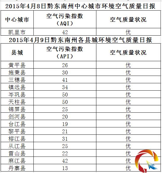 2015年4月9日黔東南州各縣(市)環境空氣質量日報