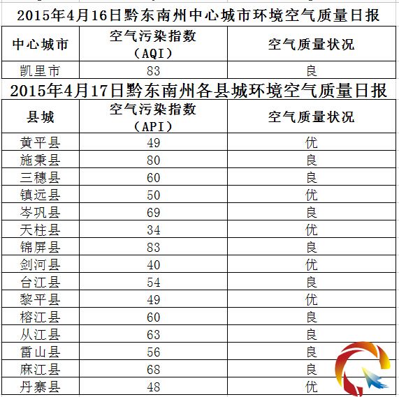 2015年4月17日黔東南州各縣(市)環境空氣質量日報