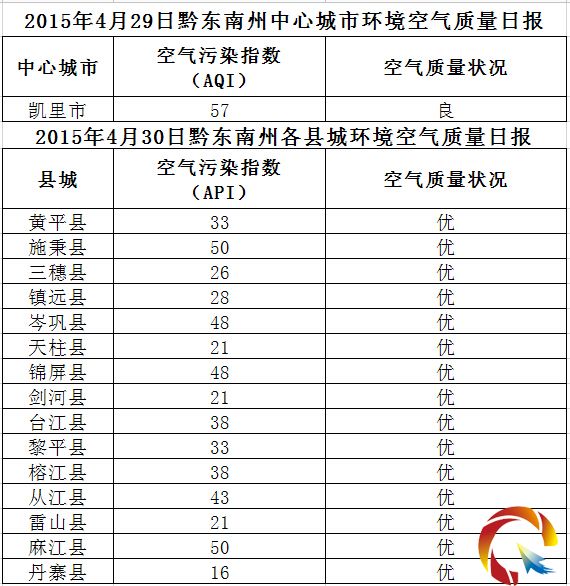 2015年4月30日黔東南州各縣(市)環(huán)境空氣質(zhì)量日?qǐng)?bào)