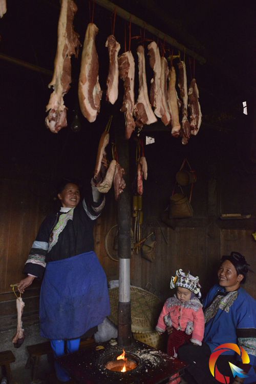 2015年1月10日,榕江縣樂里鎮(zhèn)岑勒侗寨一位侗族婦女歡慶一年一度的侗年時掛臘肉