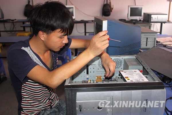 6月4日,在榕江縣計算機應用培訓班上,一名學員在維修主機。(吳開元 攝)