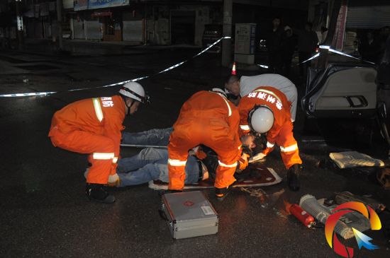 4時33分,消防官兵到達事故現場后,發現一輛小轎車“四輪朝天”翻在公路邊上,現場到處散落著車輛零部件,周圍聚集了圍觀群眾,車內有3人被困,不時發出陣陣呻吟聲。根據現場情況,消防官兵一邊安撫被困人員,一邊利用救援工具把轎車車門破拆打開,先將后排座兩名被困人員救出。隨后,消防官兵對駕駛室位置進行擴張,很快便將駕駛員救出,并將傷員送上救護車送往醫院救治。