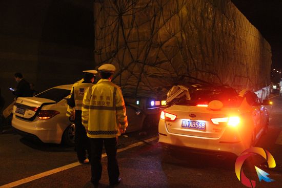 在事發現場,一輛為貴J的轎車四腳朝天躺在路上,汽油灑了一地,距這輛轎車300米處,是兩輛轎車同時與一輛運載百貨的掛車追尾的現場,其中一輛轎車頭部完全鉆到掛車底部,車上4人被困,另一輛轎車駕駛室的位置被掛車尾部削掉,駕駛員也被困在了車內。